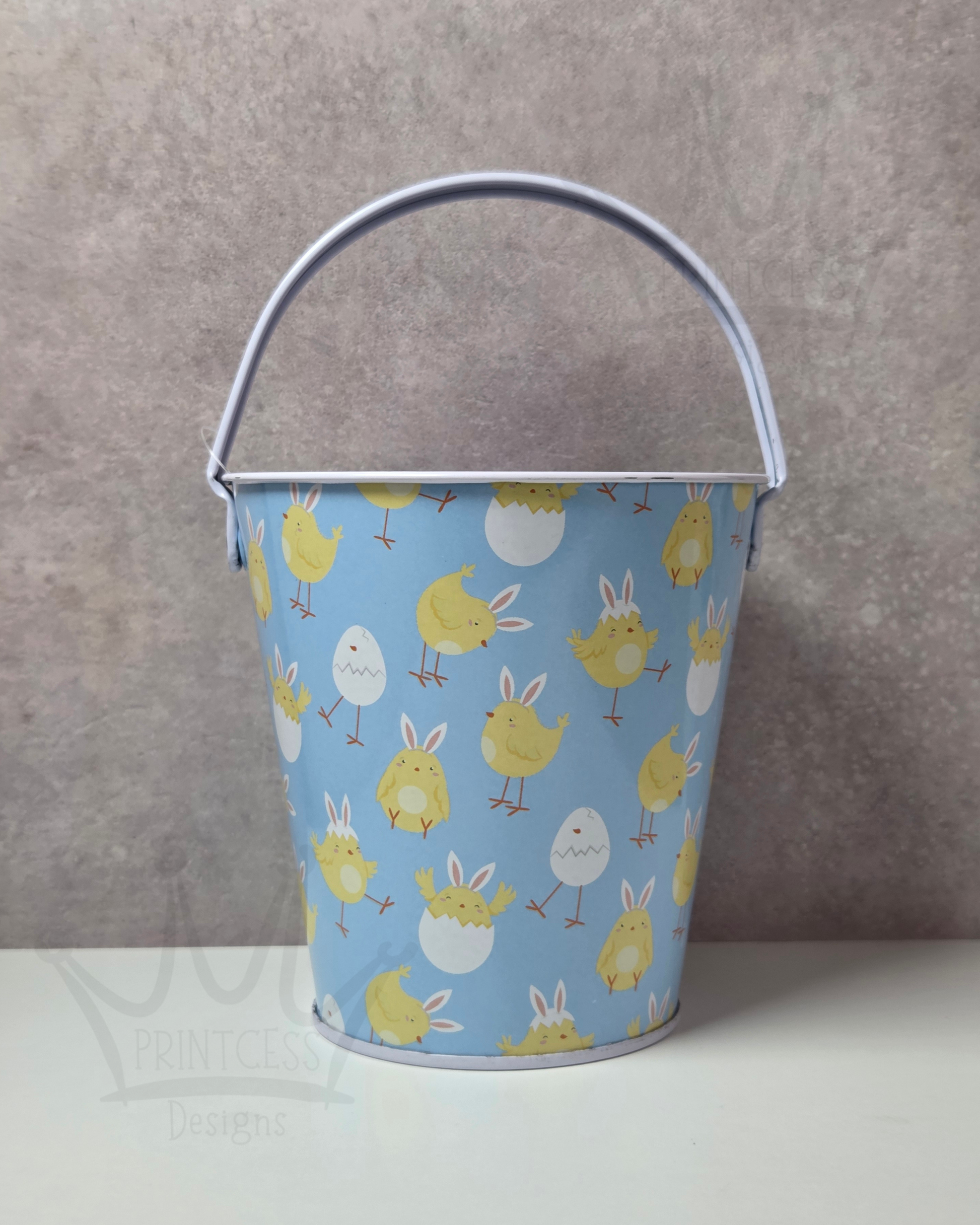 This is our pastel blue design with lots of chick's all over, with a white handle