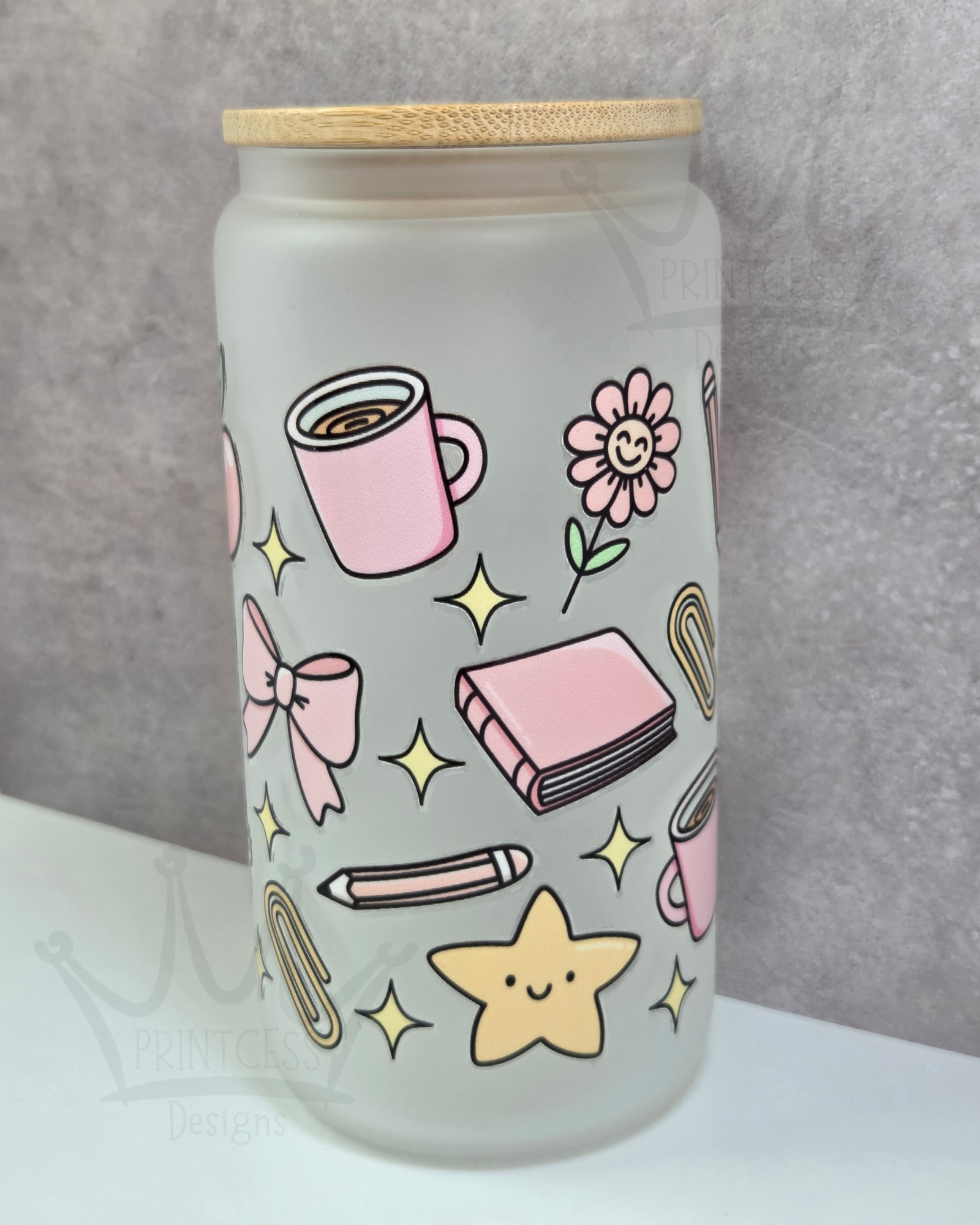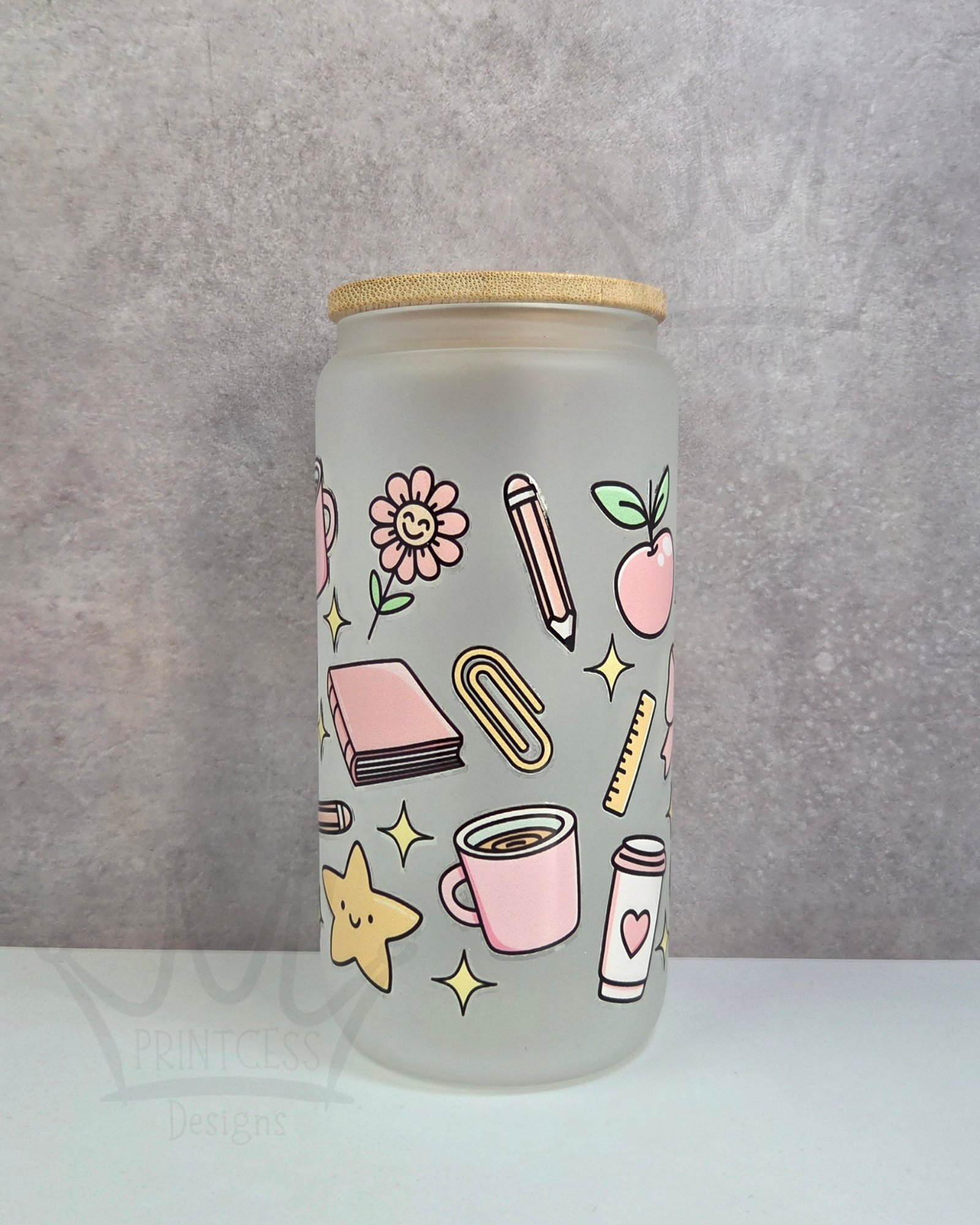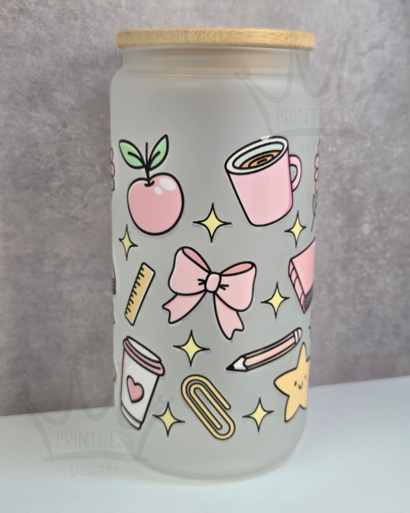 A pastel design showing images of apples, bows, mugs and stationery. A great gift for teacher's to use during their working days, to stay hydrated.